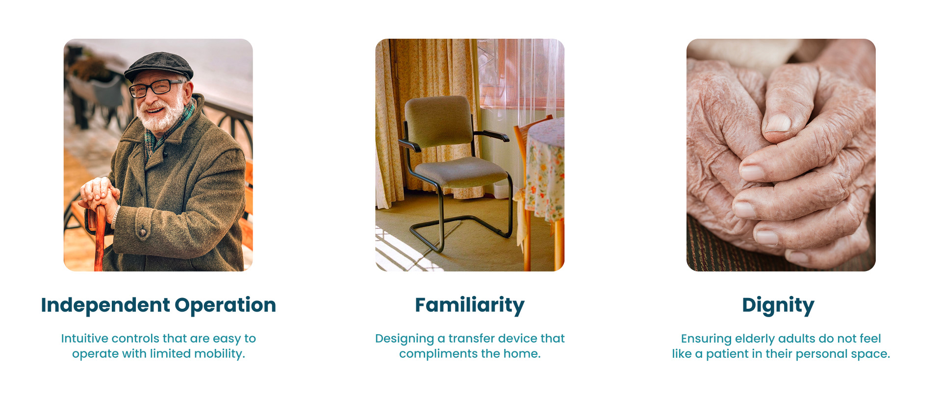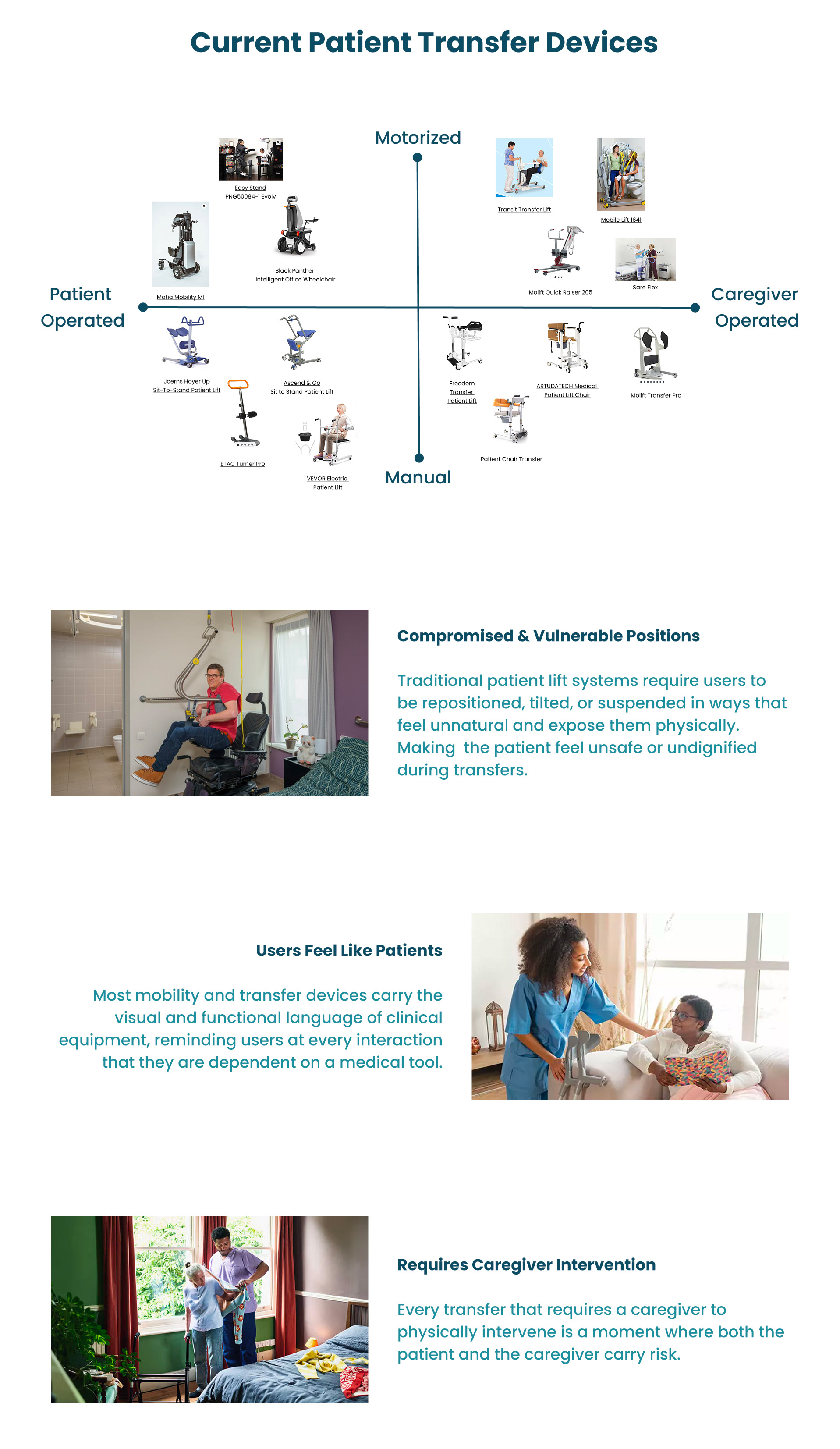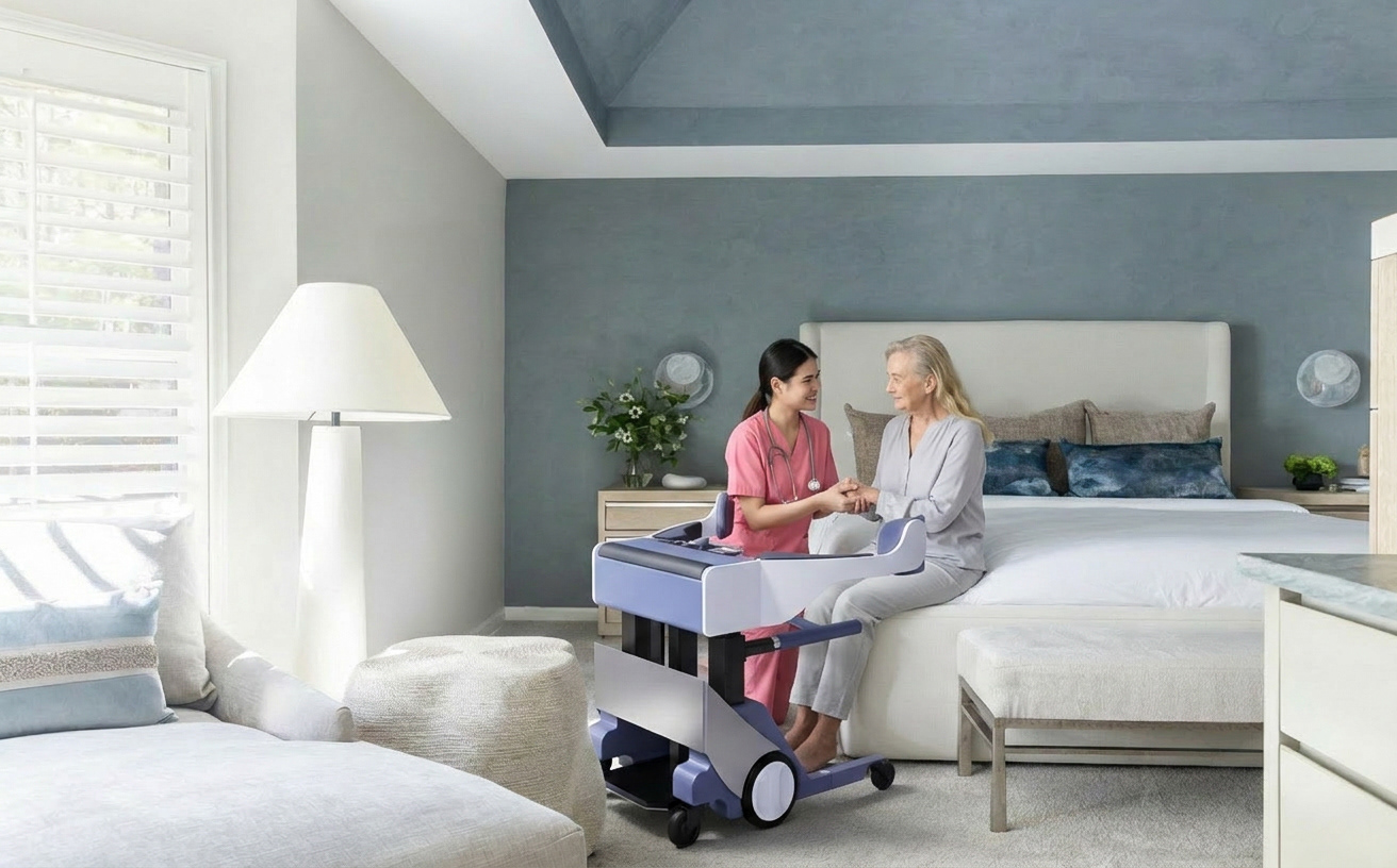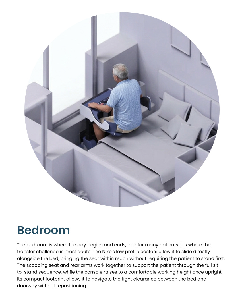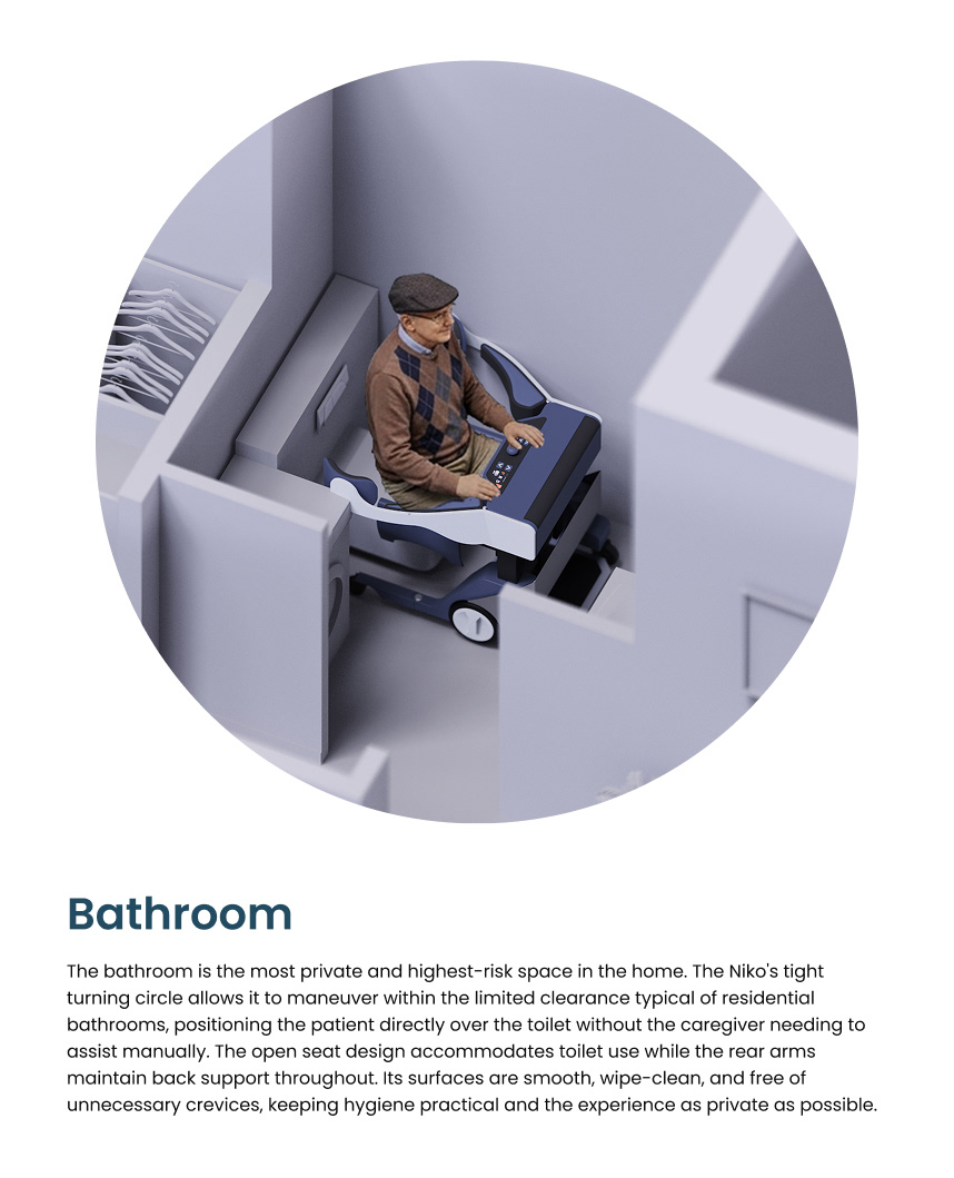 People feel safer when they have an emotional attachment to the spaces they built their lives in. A familiar environment can contribute to an older adult's sense of identity, help them remain socially connected, and support a life lived on their own terms. For individuals with limited mobility, maintaining that life often depends on the support of a caregiver or nurse who assists with the most physically demanding moments of the day. Those who care for elderly adults with limited mobility face daily challenges that strain both the caregiver and the person in their care, often in the most private and personal spaces of the home. The tools available to help are largely designed for clinical settings, and they bring that clinical feeling with them. Designing a solution that supports caregivers, restores a sense of independence to the patient, and belongs in a home or care environment without feeling institutional was the problem we set out to solve.