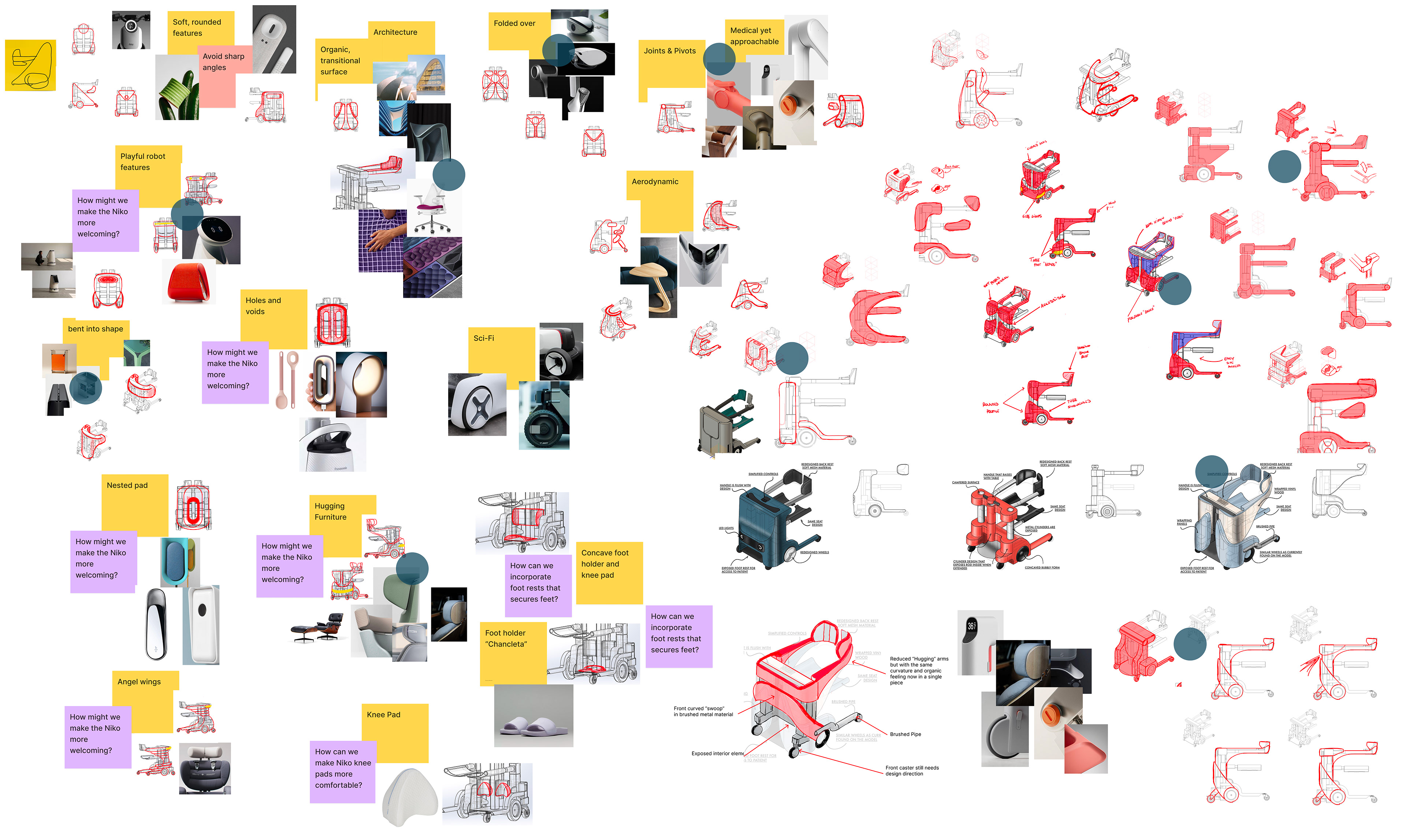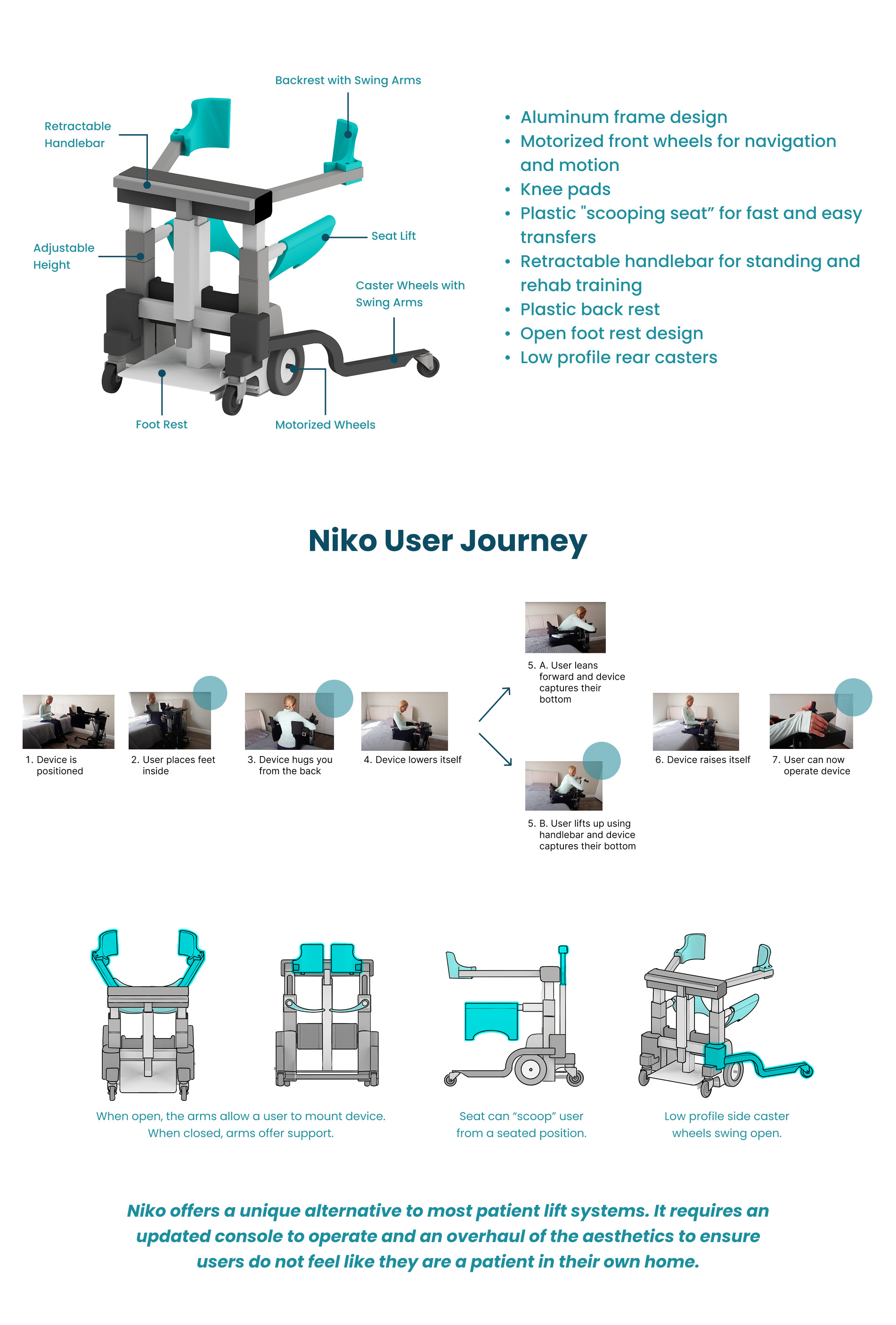 Design Scope: General Populace was engaged over a three month period to concept and design both the user experience and the exterior paneling of the second generation Niko while maintaining the existing mechanical platform. My role spanned the full design process: researching the market and existing patient transfer systems, breaking down the original prototype to identify opportunities for improvement, and contributing to brainstorming and ideation sessions that shaped the design direction. From there I took ownership of the top mounted console and arm design, led the CMF process to ensure the product balanced medical credibility with domestic warmth, and contributed to the render work , CAD development and broader branding effort.