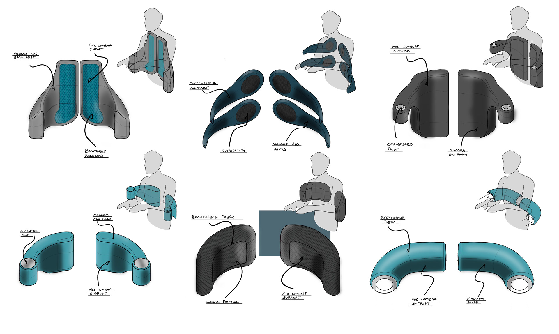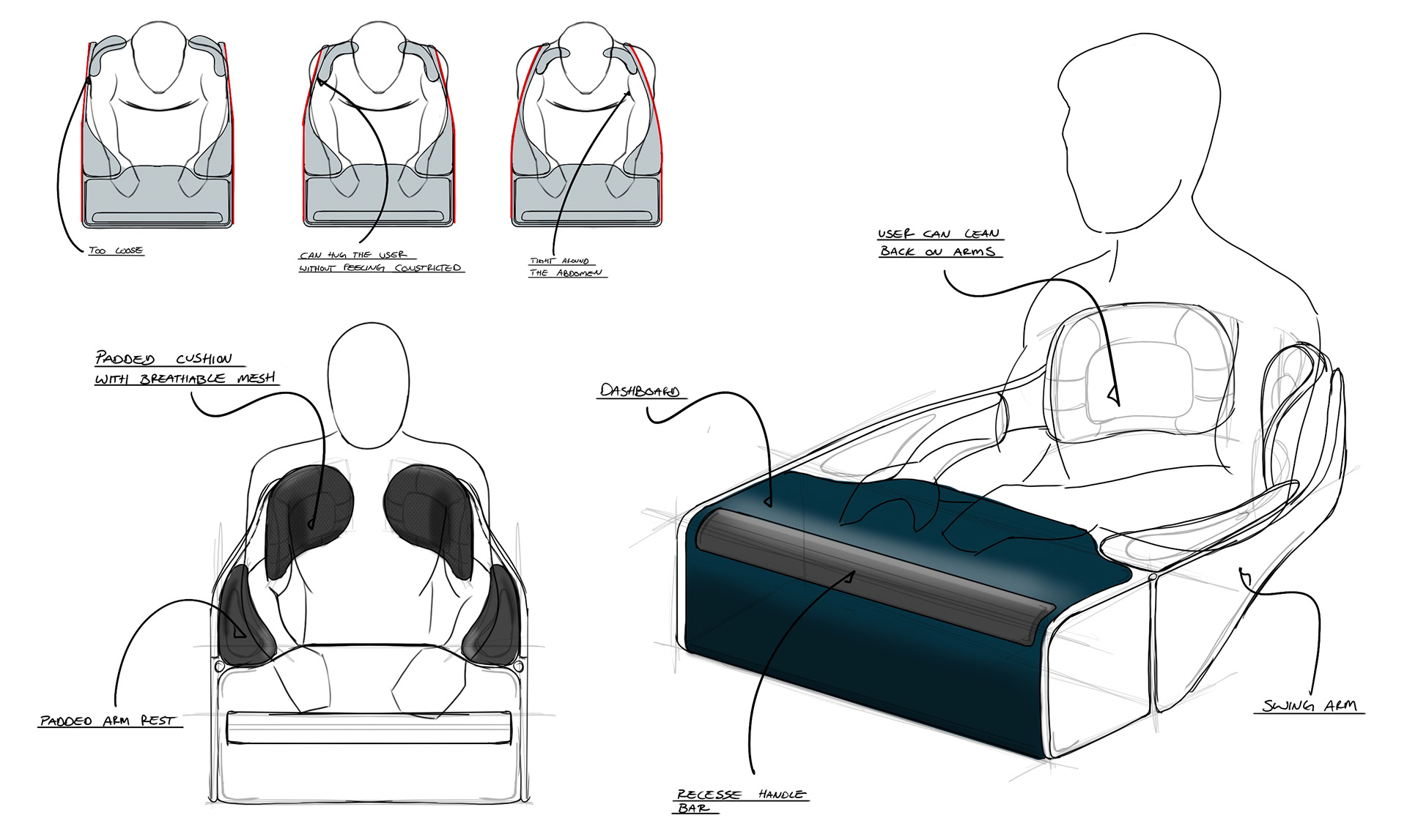 The grab handle was recessed into the frame so it sat flush and readable within the overall form rather than reading as a clinical add-on. The rear swinging arms were angled to wrap around the user, providing back support while making the act of being held feel natural rather than mechanical. Panels were selectively thickened to communicate solidity and security without adding visual weight, and a bent metal accent was introduced to break up the form while concealing the motor housing behind a detail that felt intentional.
