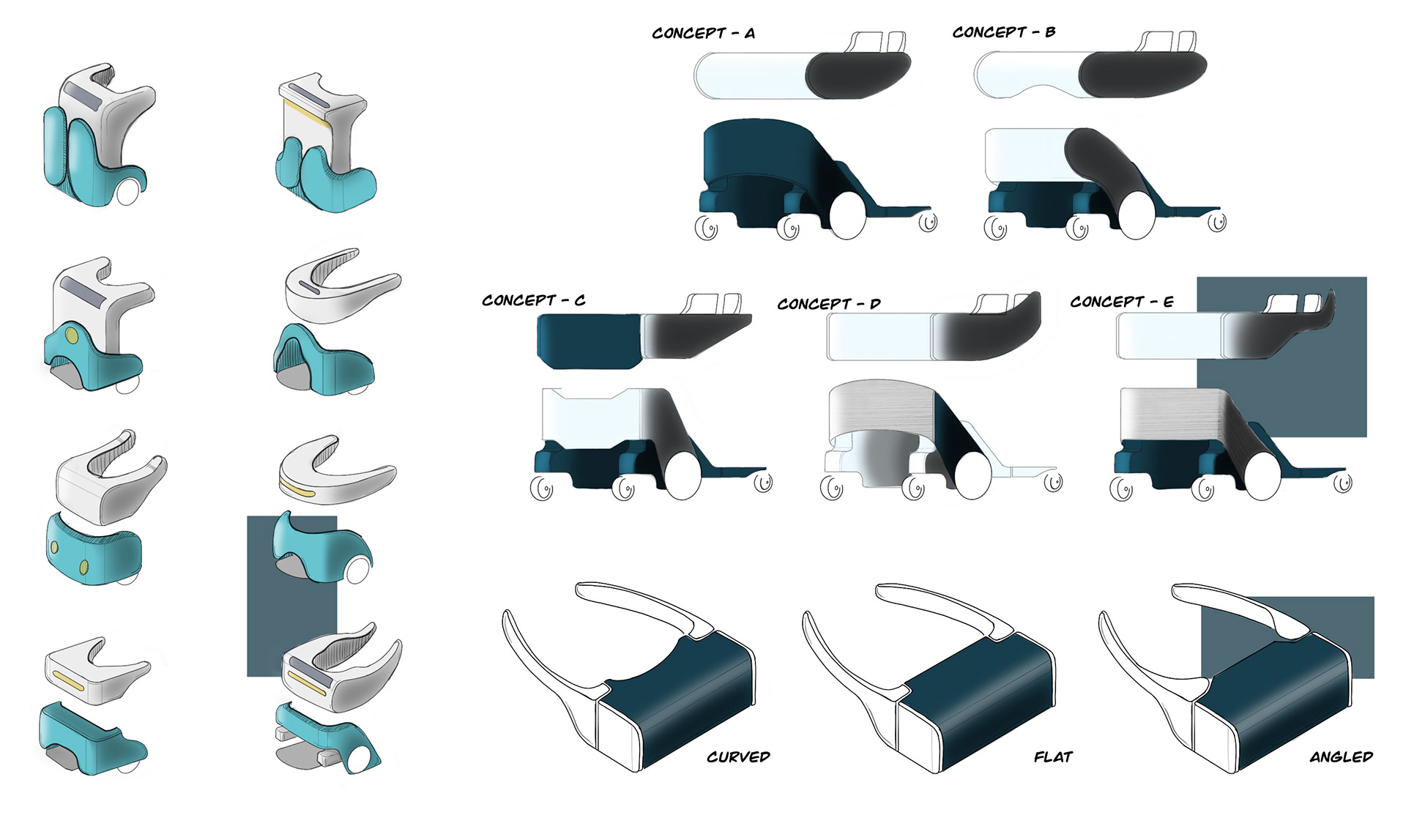 With the core system architecture defined, the design effort focused on refining the primary user interaction points that included the console interface and upper arm structure. Exploration centered on how users would approach, understand, and control the device during the transfer process. Multiple console placement and interface concepts were developed to ensure the controls were easily reachable from a seated position and intuitive for users with varying levels of dexterity. In parallel, the arm structure was refined to visually communicate support and stability while integrating with the fixed mechanical platform. Every decision was grounded in the four principles of accessible design: the form needed to be perceivable, operable, understandable, and robust, communicating its purpose and safety before anyone touched it, and performing reliably across every environment it would enter. These principles guided the evolution from early sketches to refined CAD, ensuring the interaction, structure, and visual language worked together to create a device that felt both dependable and approachable.