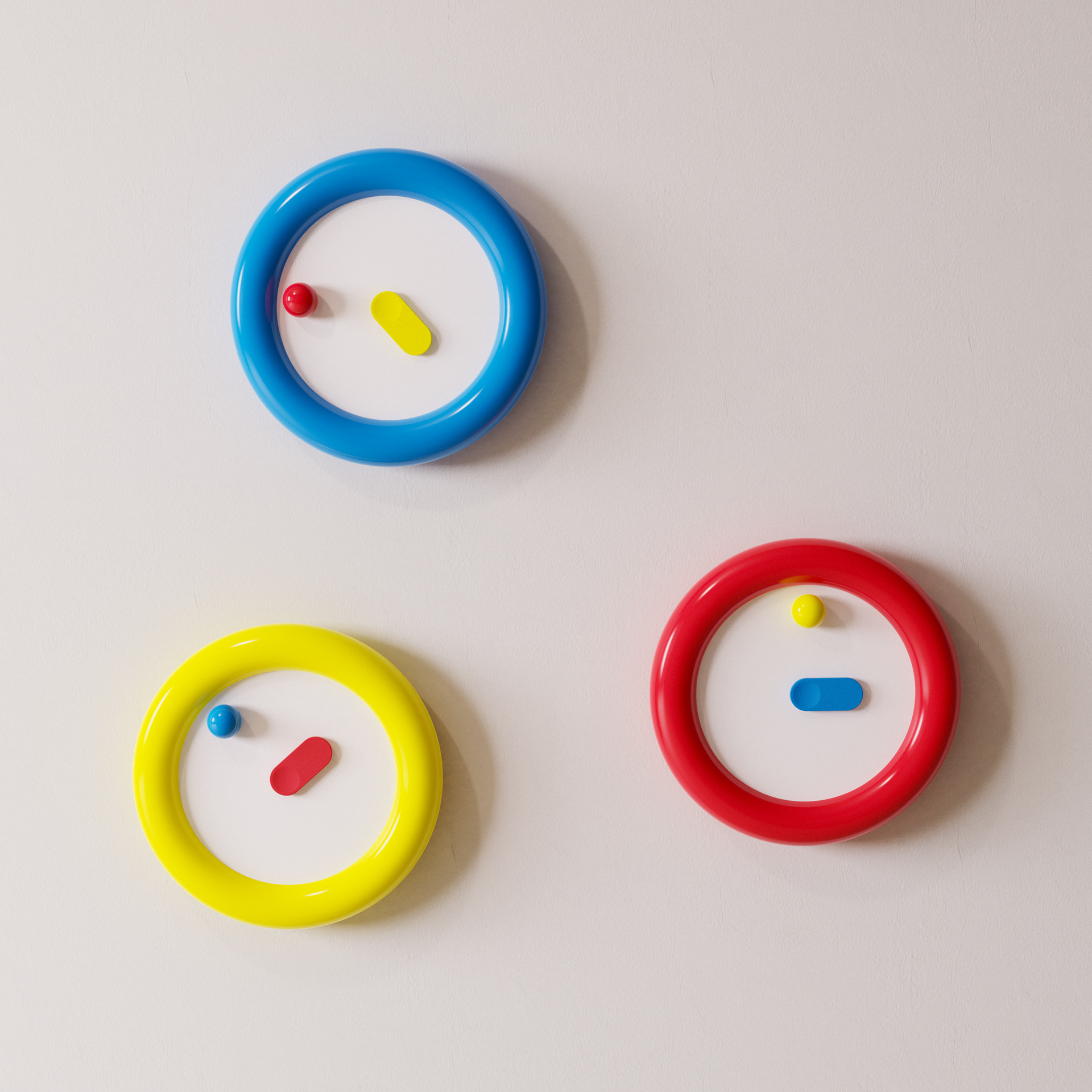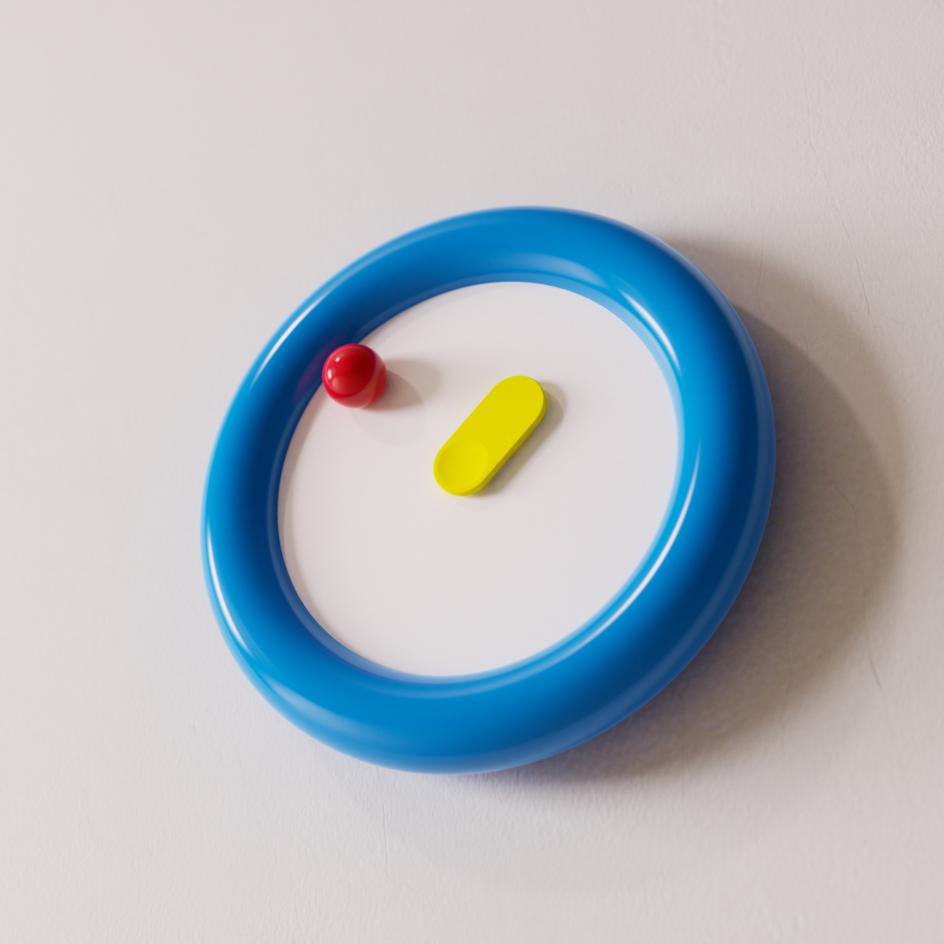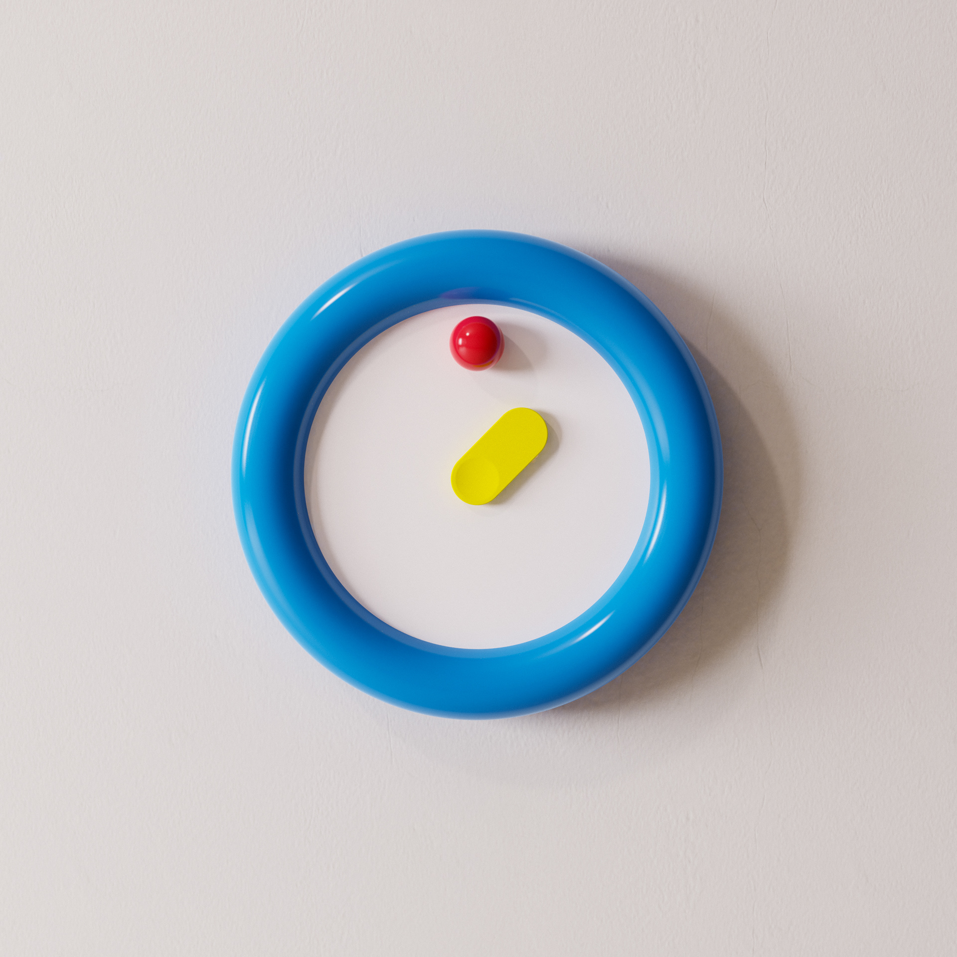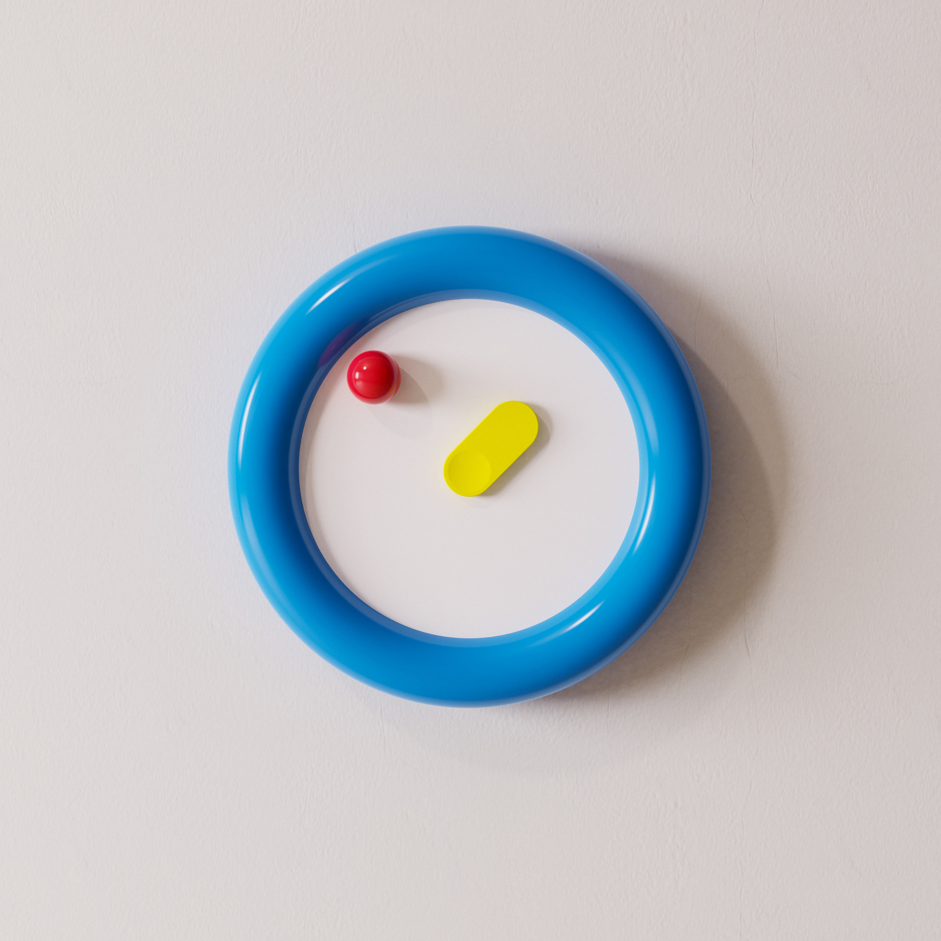 Punctual is a modern wall clock that blends function with playfulness. Its bold blue frame and clean white face create a striking backdrop for the two vibrant time indicators: a bright yellow hour hand, and a magnetic red dot that orbits smoothly to mark the minutes. The clock turns the passage of time into a simple and joyful interaction. Been on a huge primary colors kick lately.